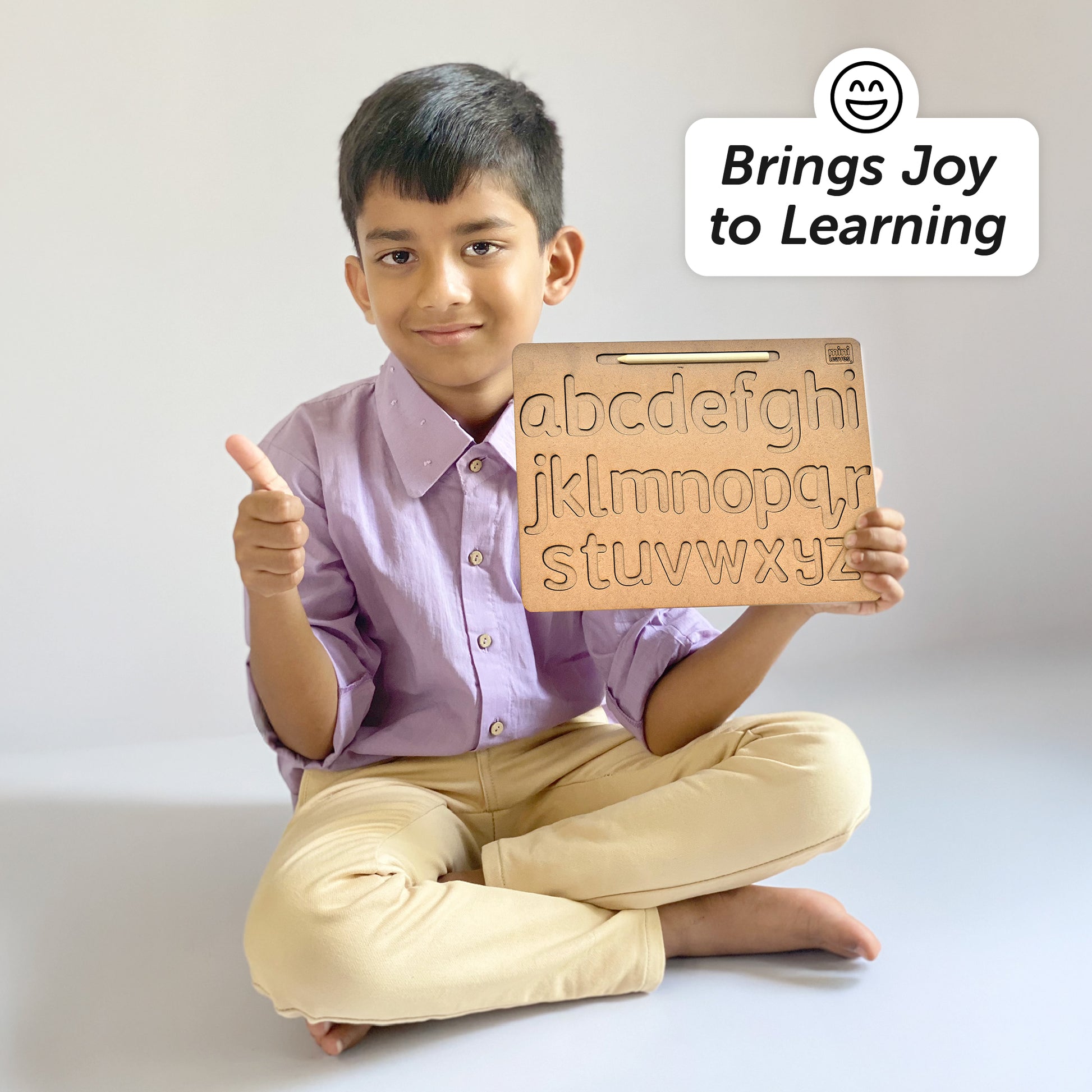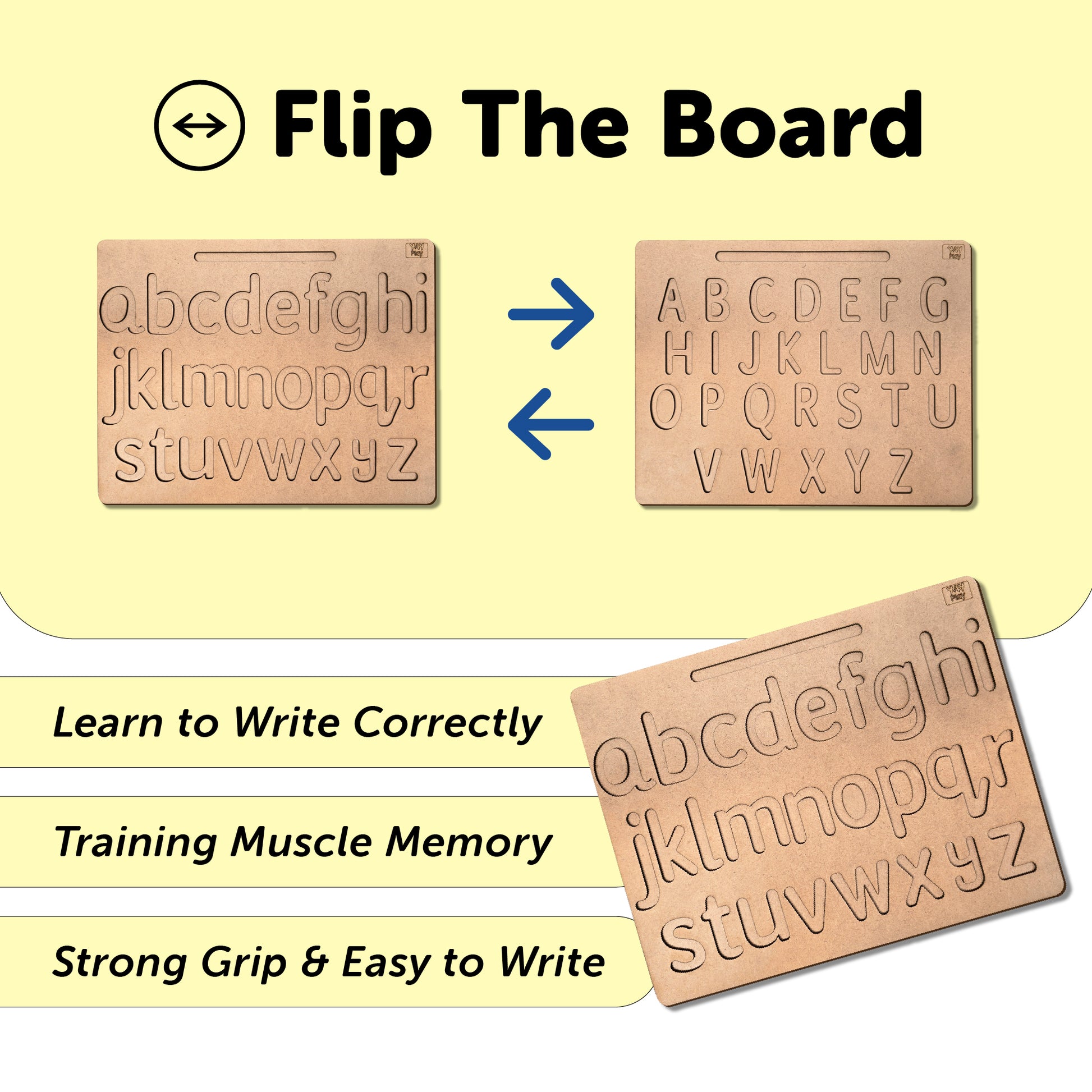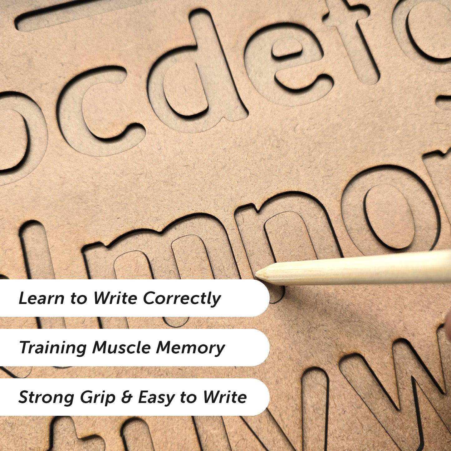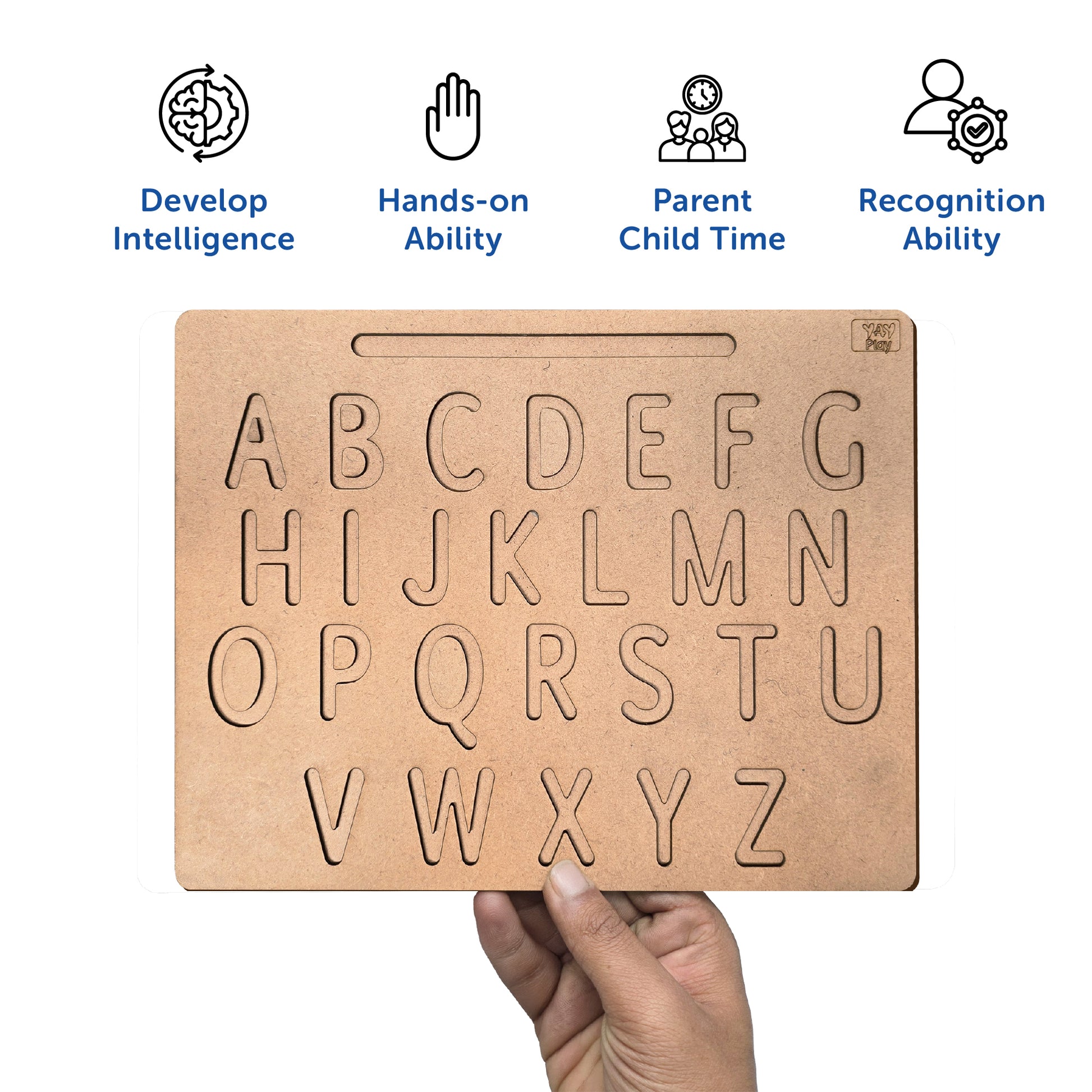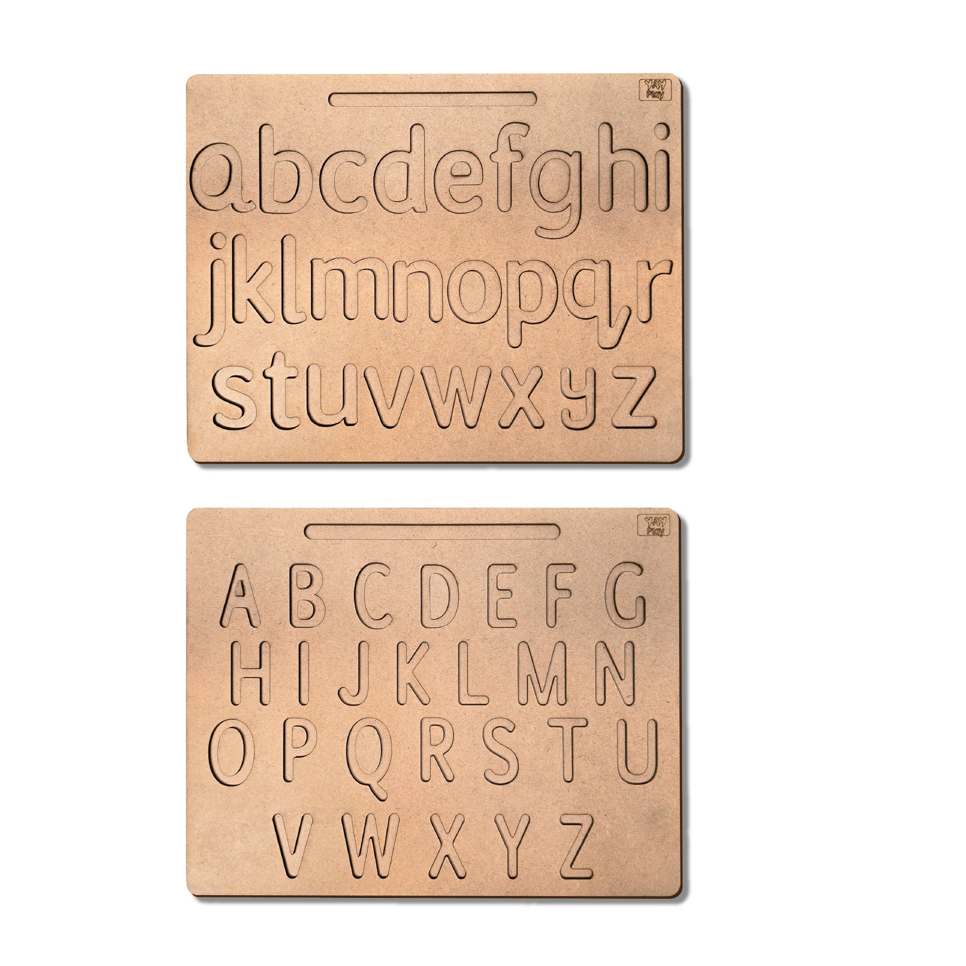 - This is a wonderful engraved board to help your child for brain development to form correctly. The set contains engraved on natural MDF board and a wooden dummy pencil child can use the wooden pencil to tracing the letters on the board.